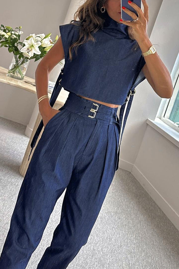 Posie High Neck Side Straps Top and Cargo Belt Pocketed Pants Set