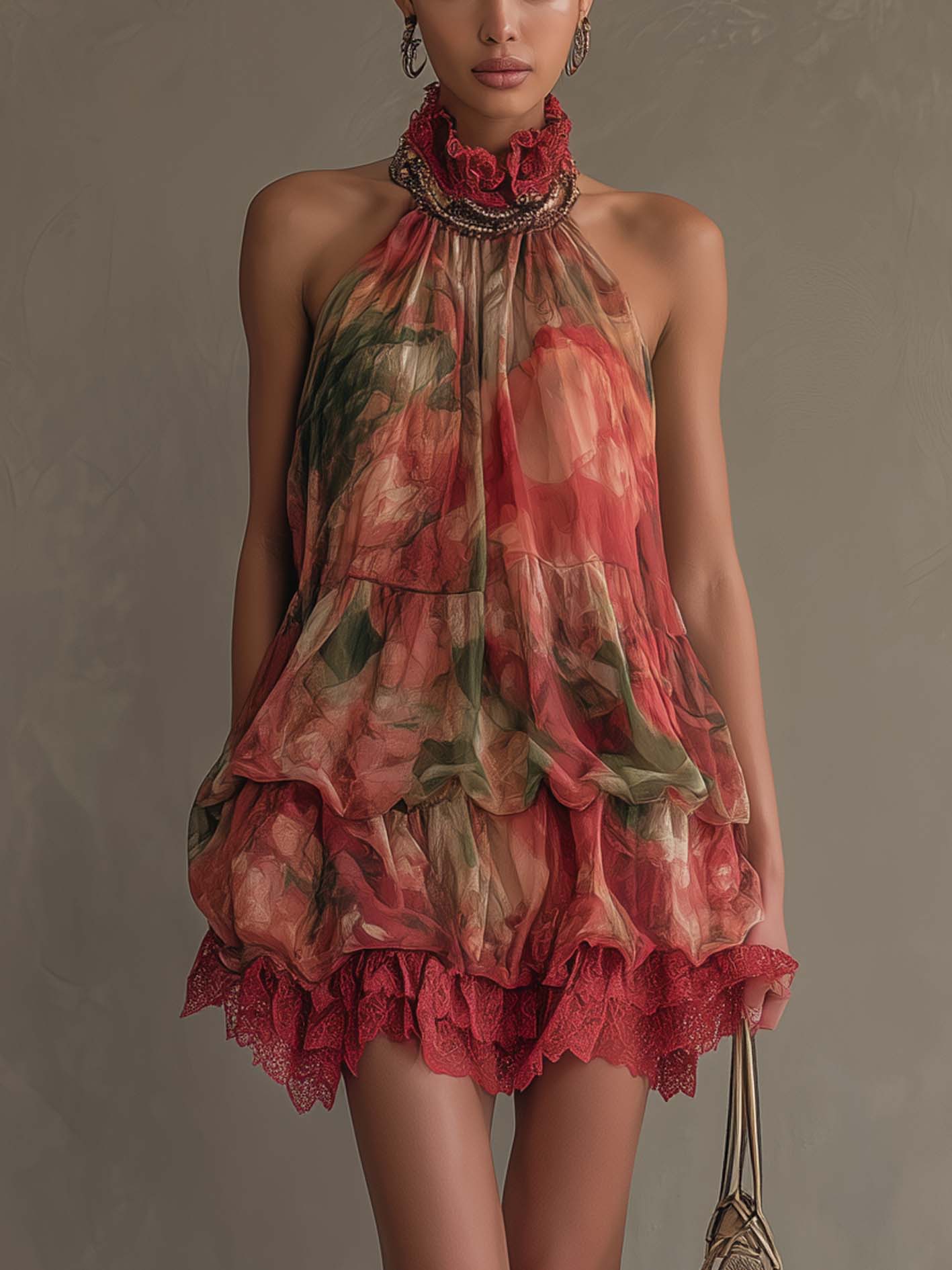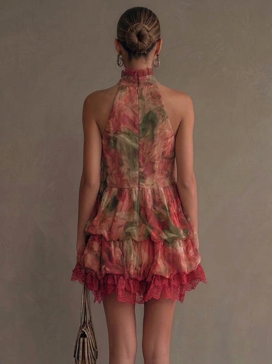 Design: The dress showcases a halter neck style with gathered detailing, highlighting the shoulders and neckline. The layered chiffon and lace ruffle hem enhance depth and movement.