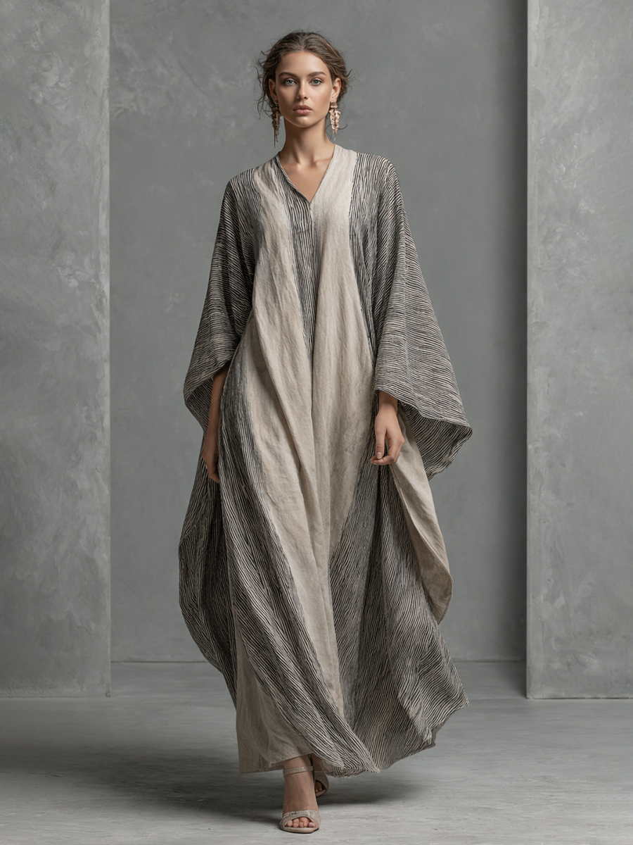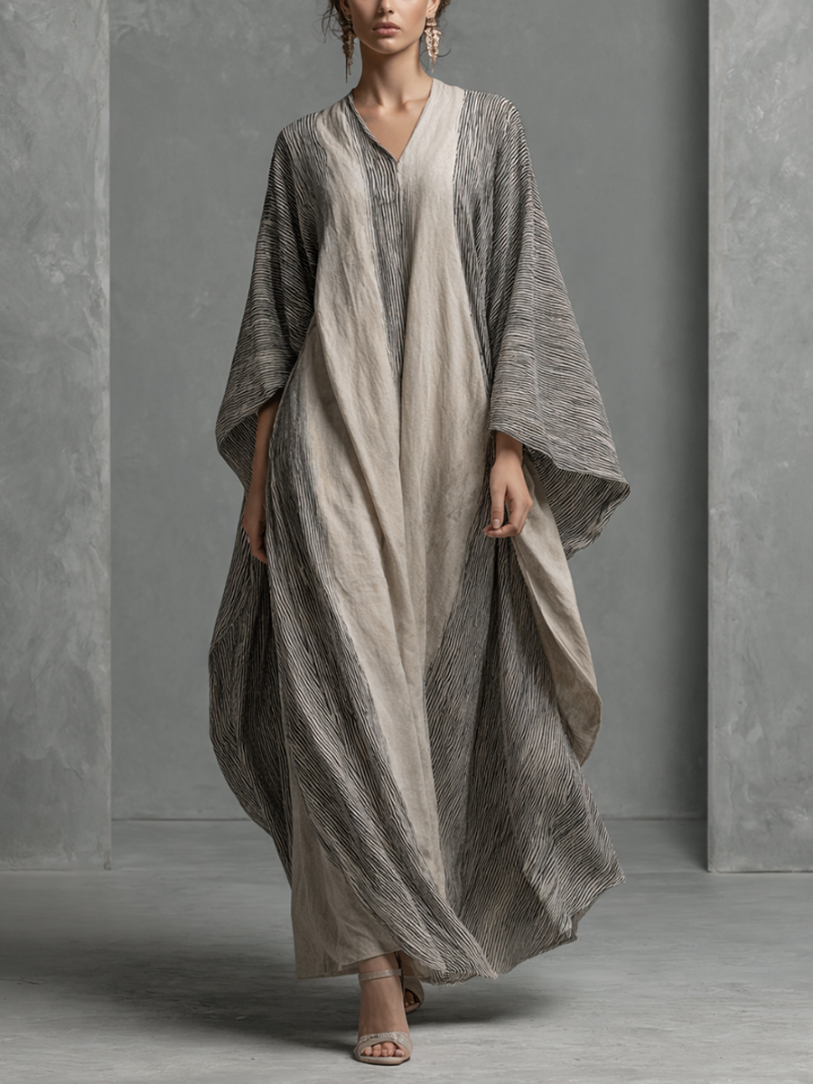Women's Boho Striped V-Neck Cotton Linen Oversized Kaftan Maxi Dress